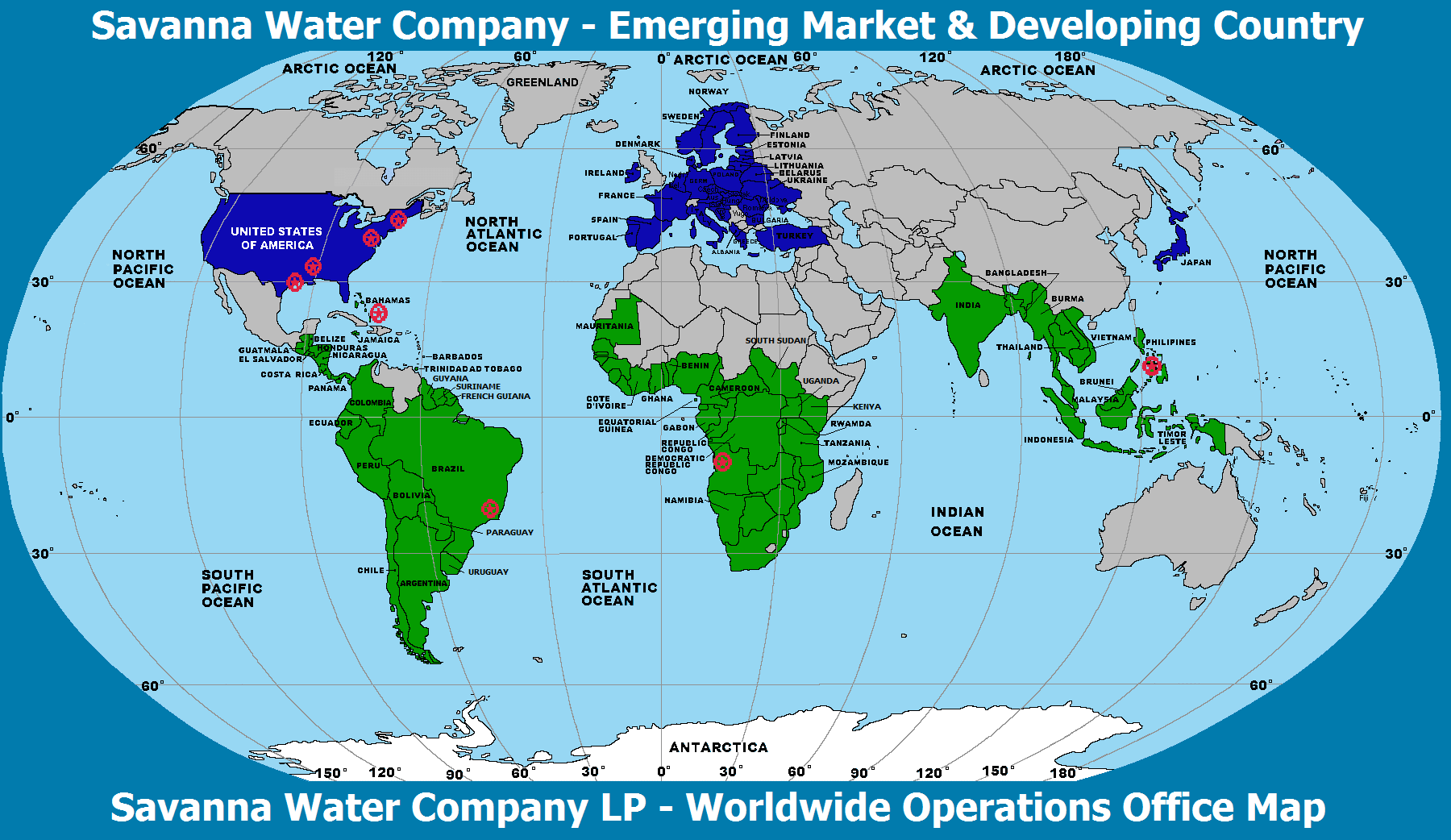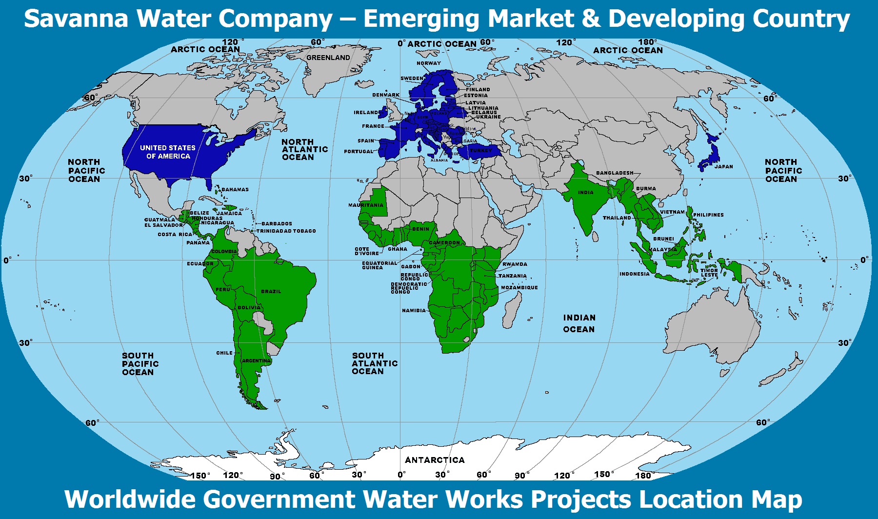 The Green countries in the America’s, Africa, and South Asia, are the Emerging Markets and Developing Countries that are strategically selected for Investment Bankers of Europe, Japan, and the United States, to become a Limited Partner of Savanna Water Company.